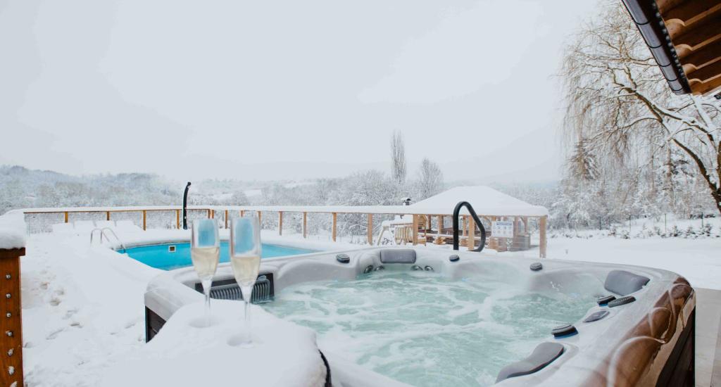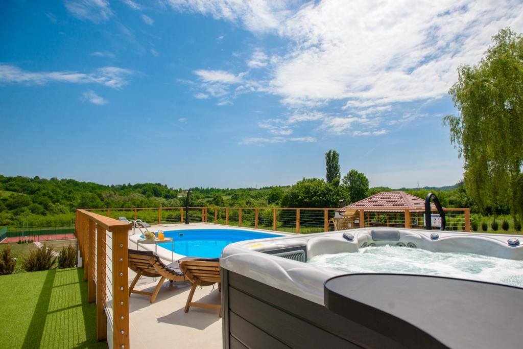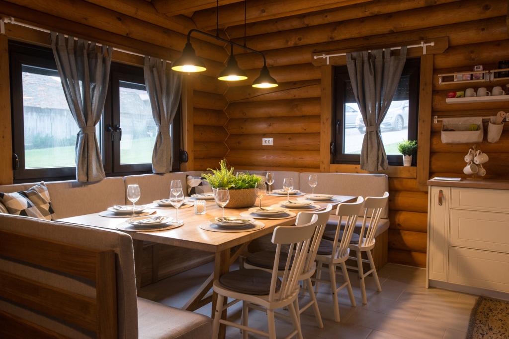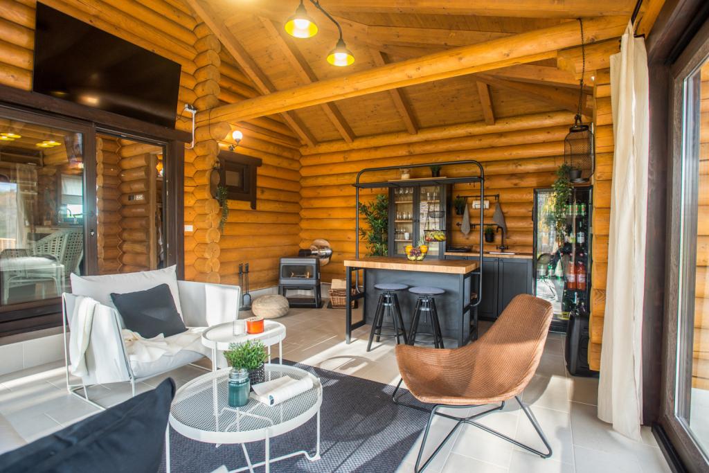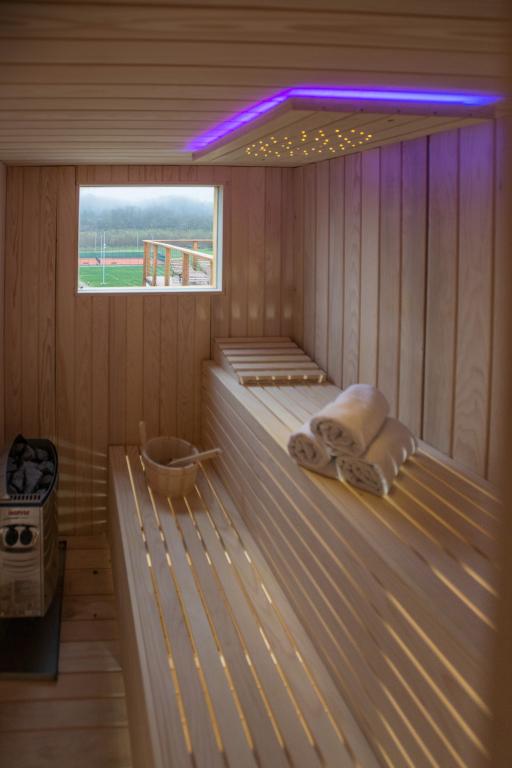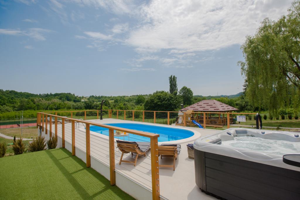 Wooden house made of Siberian pine. House: maximum no. beds 10, house 108 m2, terrace with pool 105 m2, sauna, jacuzzi, gazebo 30 m2. garden over 7,000 m2, parking, living room with kitchen, 3 bedrooms, bathroom with shower and toilet. Closed terrace with fireplace, tennis court for socializing and sports, changing room with shower and toilet, gazebo with barbecue, fishing rod and necessary equipment. Children's playground, 4 TVs, darts.