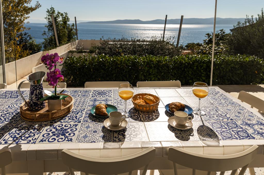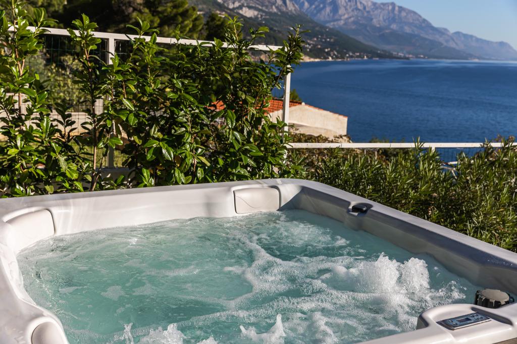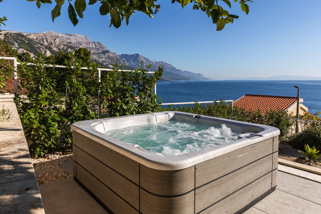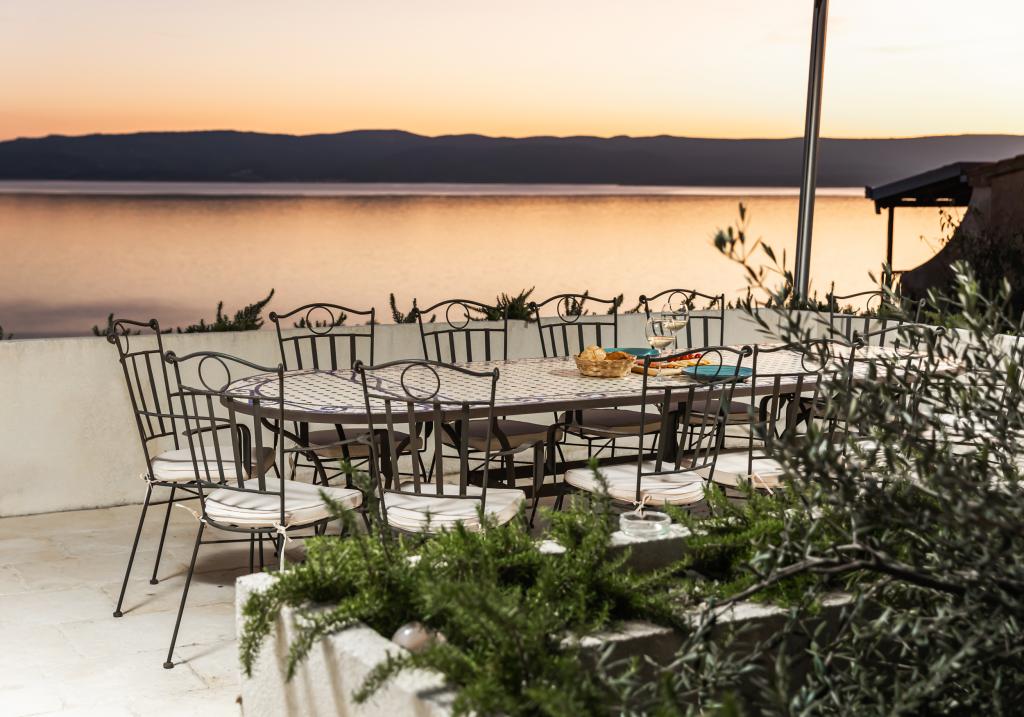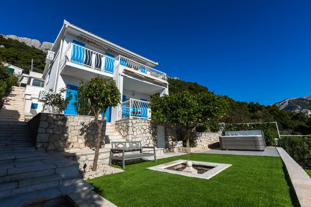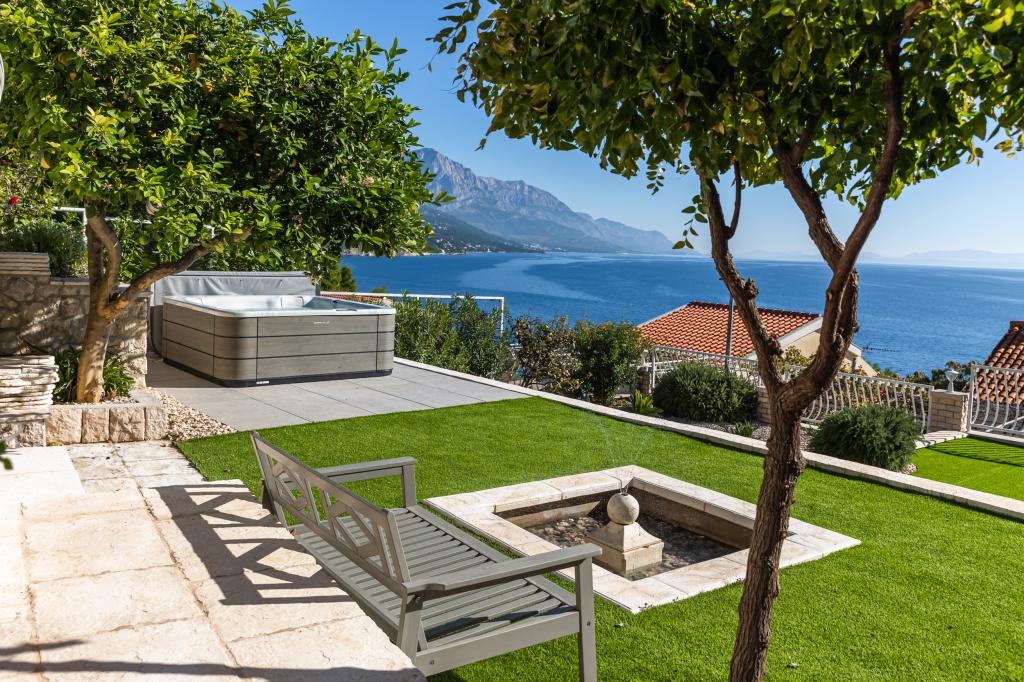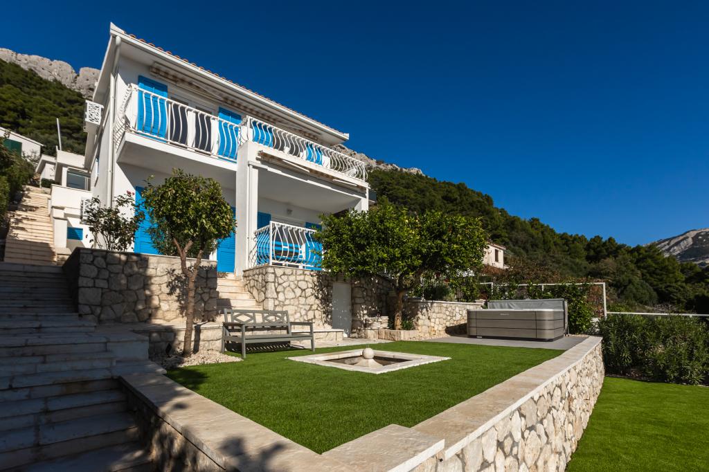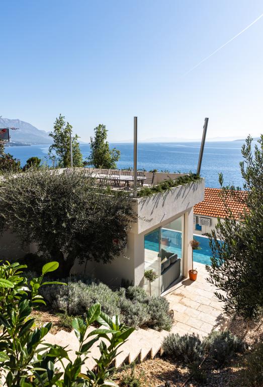 The idyllic Villa Leview, located in a quiet part of Pisak, will delight you with its spacious green courtyard and garden oases and a beautiful open view of the sea. As its name suggests, Villa Leview has an open view of the sea from every part of the house, whether you are in the kitchen, living room or bedroom. The heated pool and hot tub will make your stay enjoyable even outside the summer season. The house has five bedrooms and provides comfortable accommodation for 10 people. The rooms are equipped with spring box beds, of which three rooms have double box beds 180cm wide and two rooms have two separate beds 90cm wide. A fold-out children's bed is also available. Next to the pool is a spacious living room where you can also enjoy the sea view. The kitchen and dining room for 10 people are connected to a beautiful dining terrace with an unforgettable view of the sea and islands as well as Mount Biokovo in the background. The house has two garages for 4 cars.
