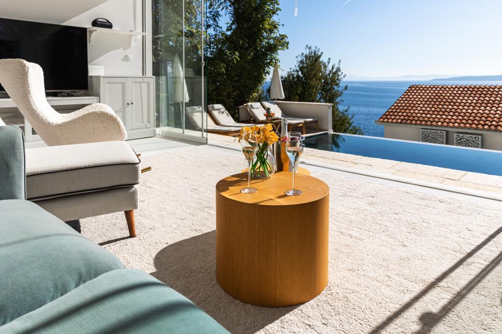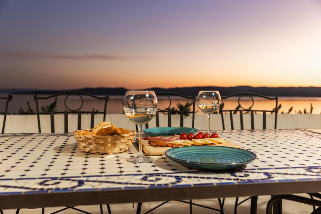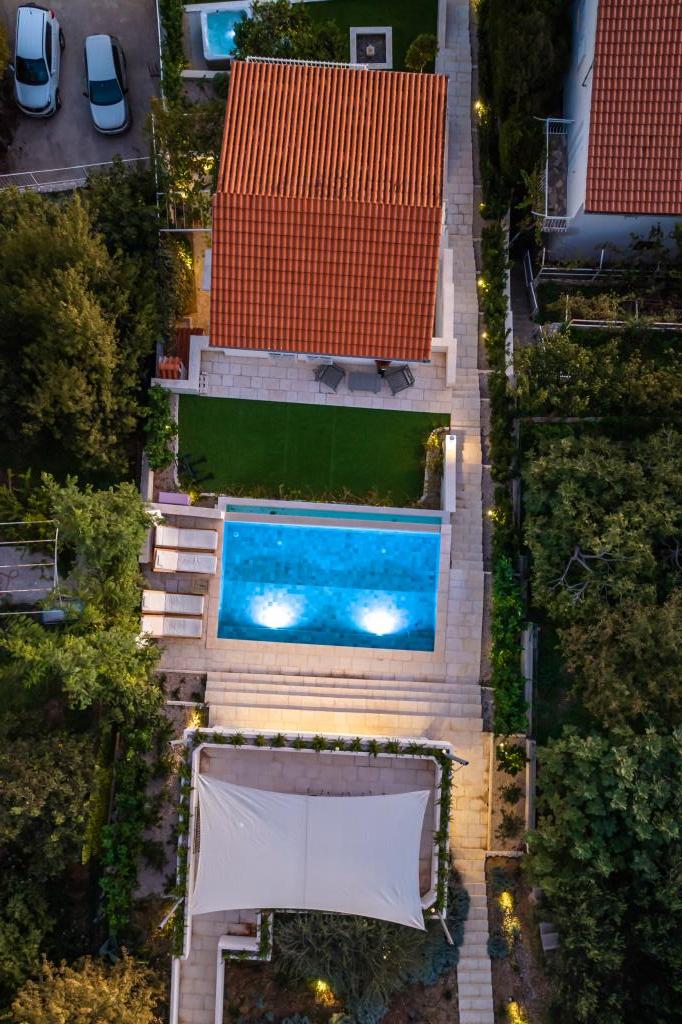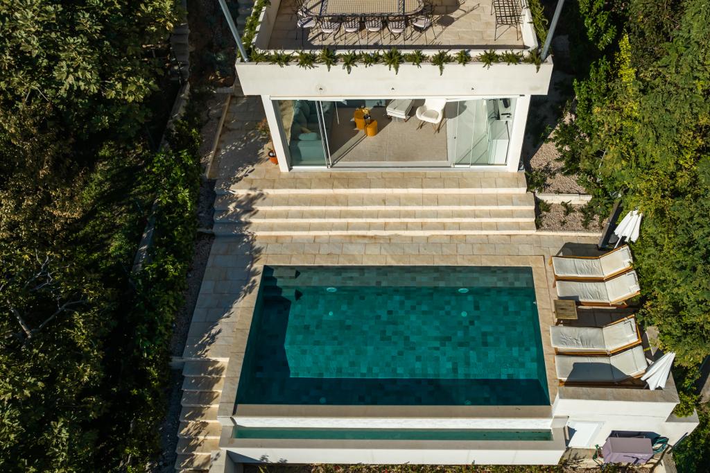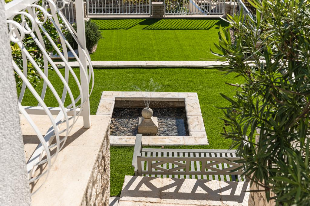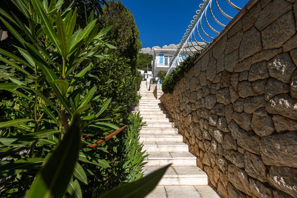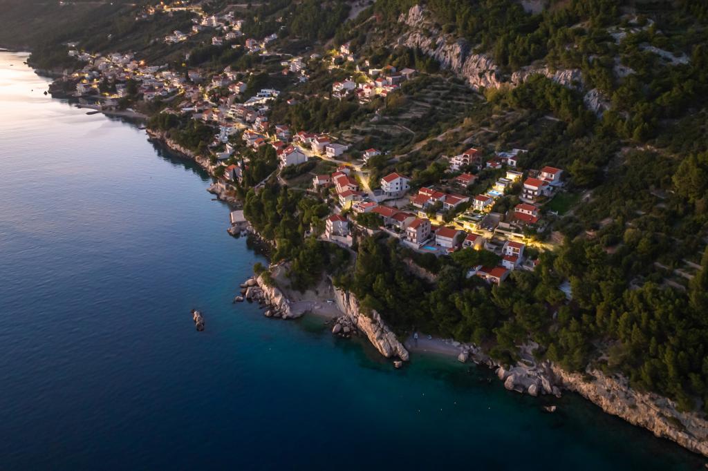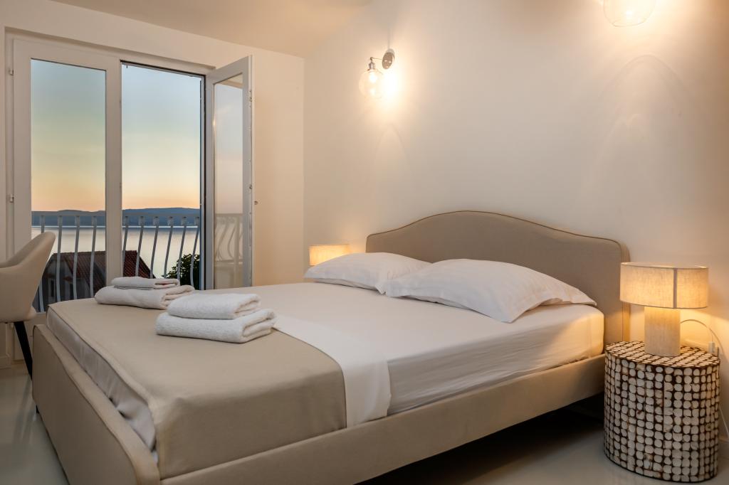 The idyllic Villa Leview, located in a quiet part of Pisak, will delight you with its spacious green courtyard and garden oases and a beautiful open view of the sea. As its name suggests, Villa Leview has an open view of the sea from every part of the house, whether you are in the kitchen, living room or bedroom. The heated pool and hot tub will make your stay enjoyable even outside the summer season. The house has five bedrooms and provides comfortable accommodation for 10 people. The rooms are equipped with spring box beds, of which three rooms have double box beds 180cm wide and two rooms have two separate beds 90cm wide. A fold-out children's bed is also available. Next to the pool is a spacious living room where you can also enjoy the sea view. The kitchen and dining room for 10 people are connected to a beautiful dining terrace with an unforgettable view of the sea and islands as well as Mount Biokovo in the background. The house has two garages for 4 cars.