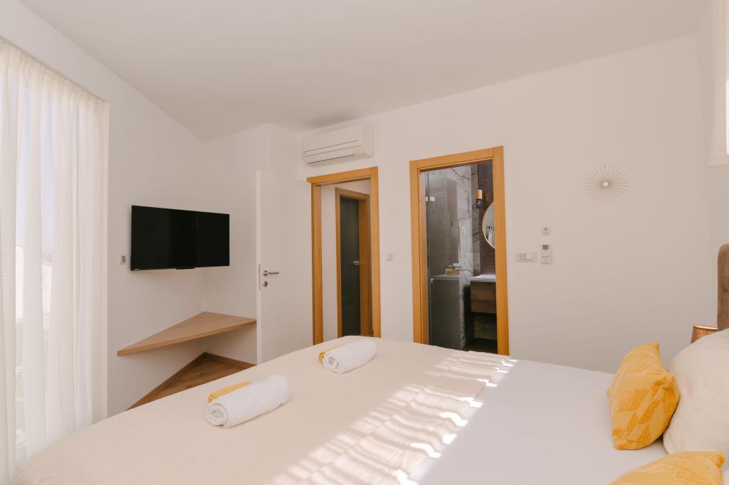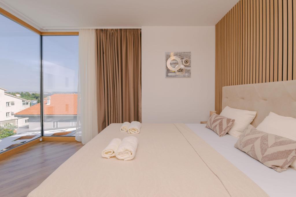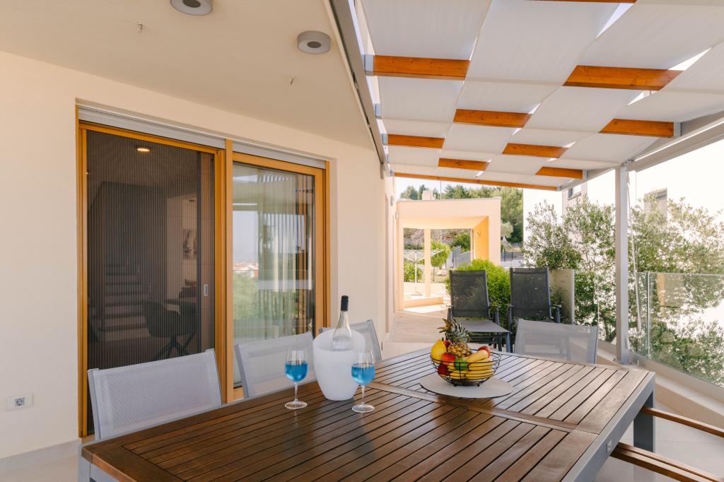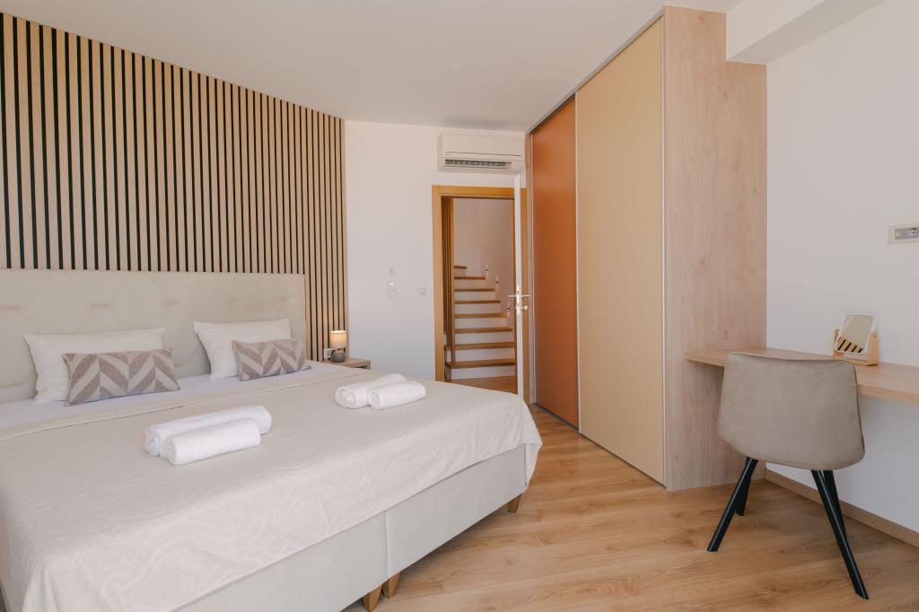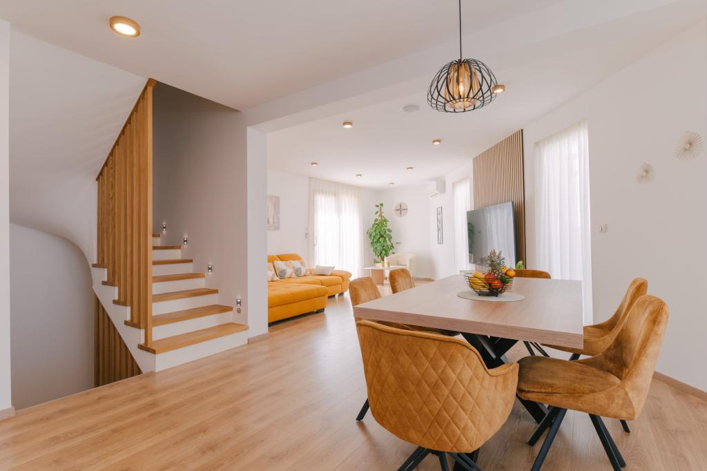 Three modern master bedrooms are located upstairs, while one guest room is located in the basement. All bathrooms are equipped with top-of-the-line Grohe and Laufen fittings, prestigious designer ceramic tiles and elegant glass doors. The house is officially categorized by the Ministry of Tourism of the Republic of Croatia, which allows for comfortable accommodation for 9, even 10 guests. The open-plan living and dining room, as well as each bedroom, are equipped with individual air conditioners with a quiet mode, perfect for a peaceful sleep. The modern kitchen, from the famous Austrian brand DanKüchen, is fully equipped with top-of-the-line appliances, including a refrigerator with ice maker and a cold water dispenser.