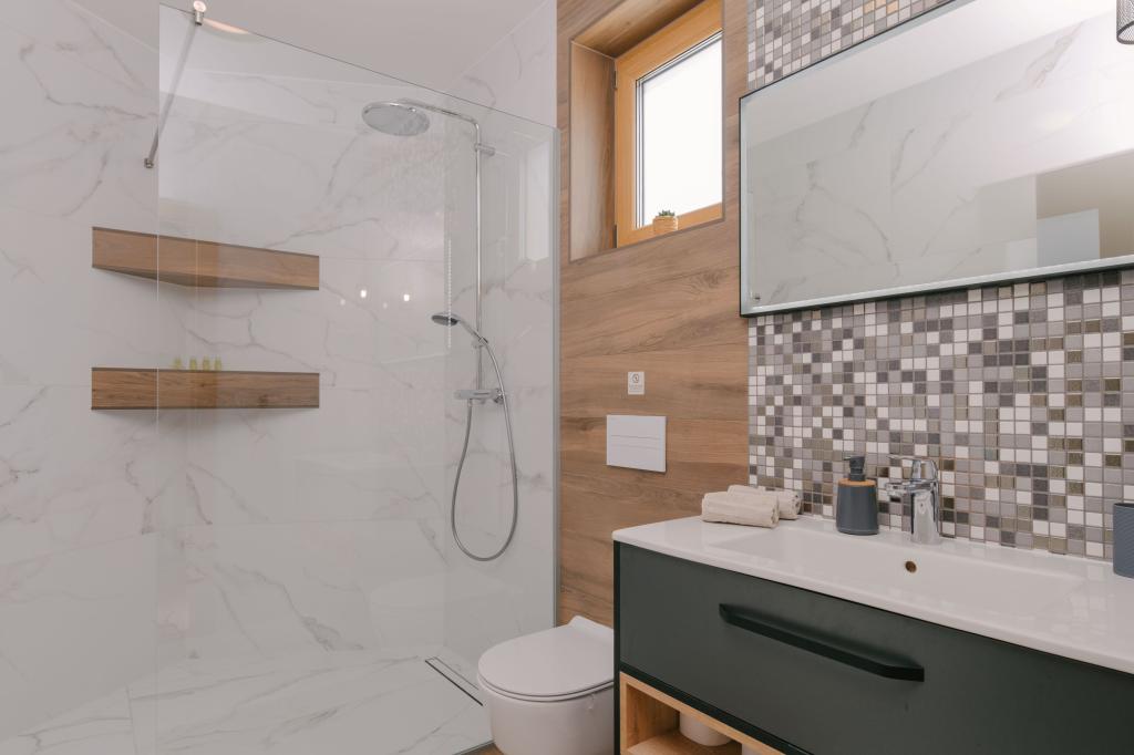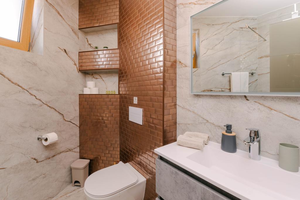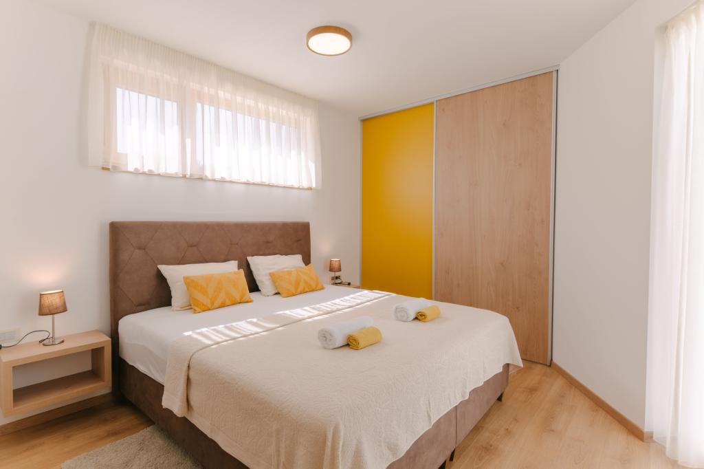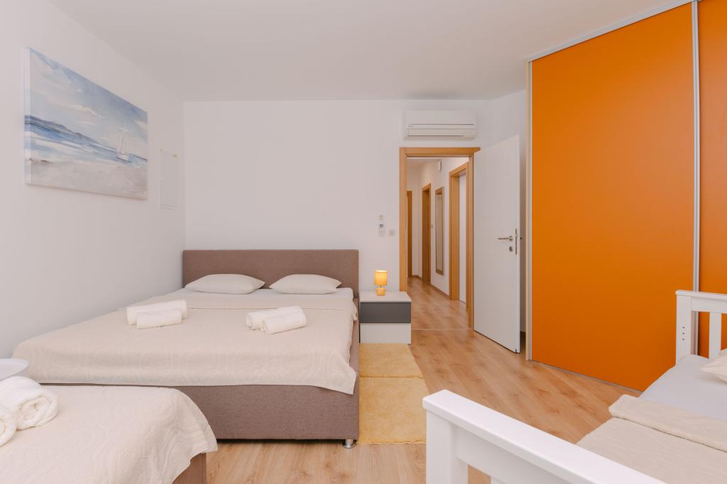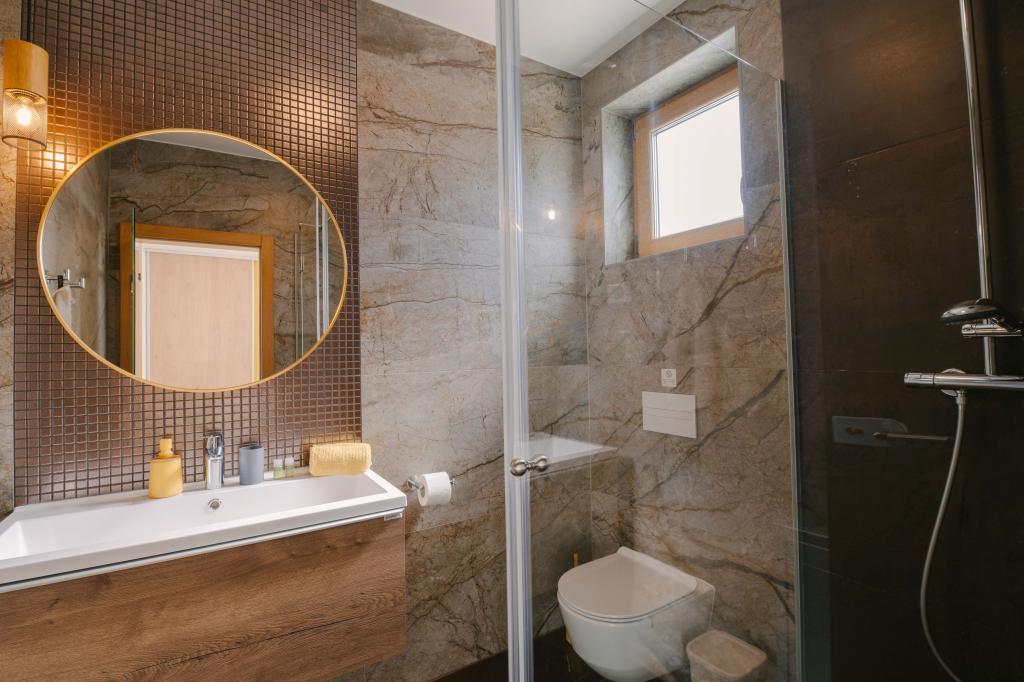 Three modern master bedrooms are located upstairs, while one guest room is located in the basement. All bathrooms are equipped with top-of-the-line Grohe and Laufen fittings, prestigious designer ceramic tiles and elegant glass doors. The house is officially categorized by the Ministry of Tourism of the Republic of Croatia, which allows for comfortable accommodation for 9, even 10 guests. The open-plan living and dining room, as well as each bedroom, are equipped with individual air conditioners with a quiet mode, perfect for a peaceful sleep. The modern kitchen, from the famous Austrian brand DanKüchen, is fully equipped with top-of-the-line appliances, including a refrigerator with ice maker and a cold water dispenser.
