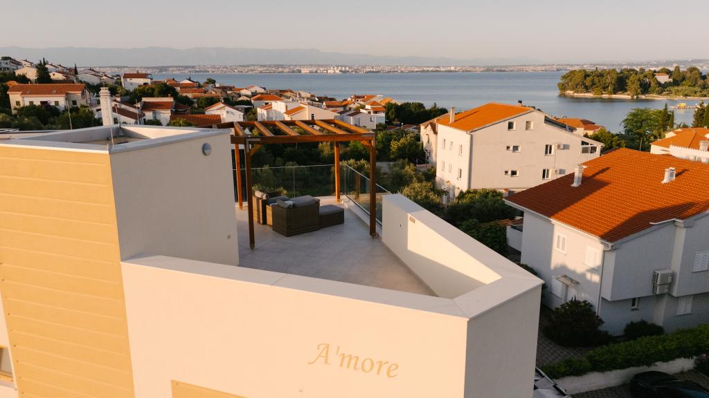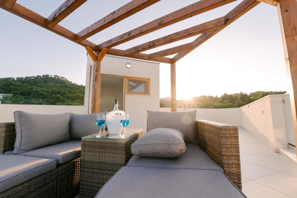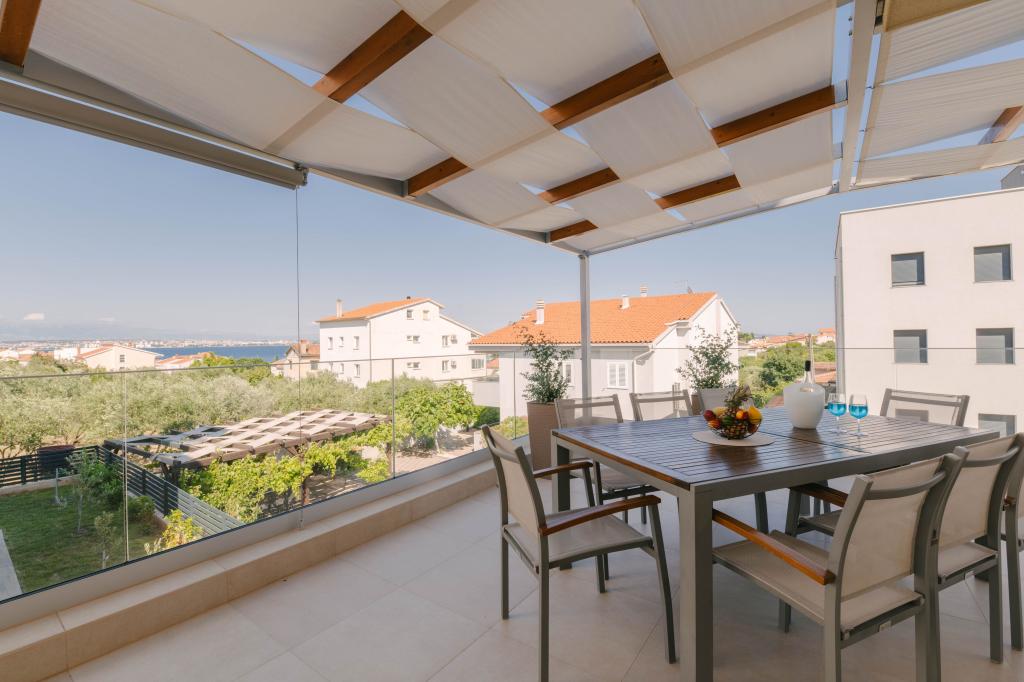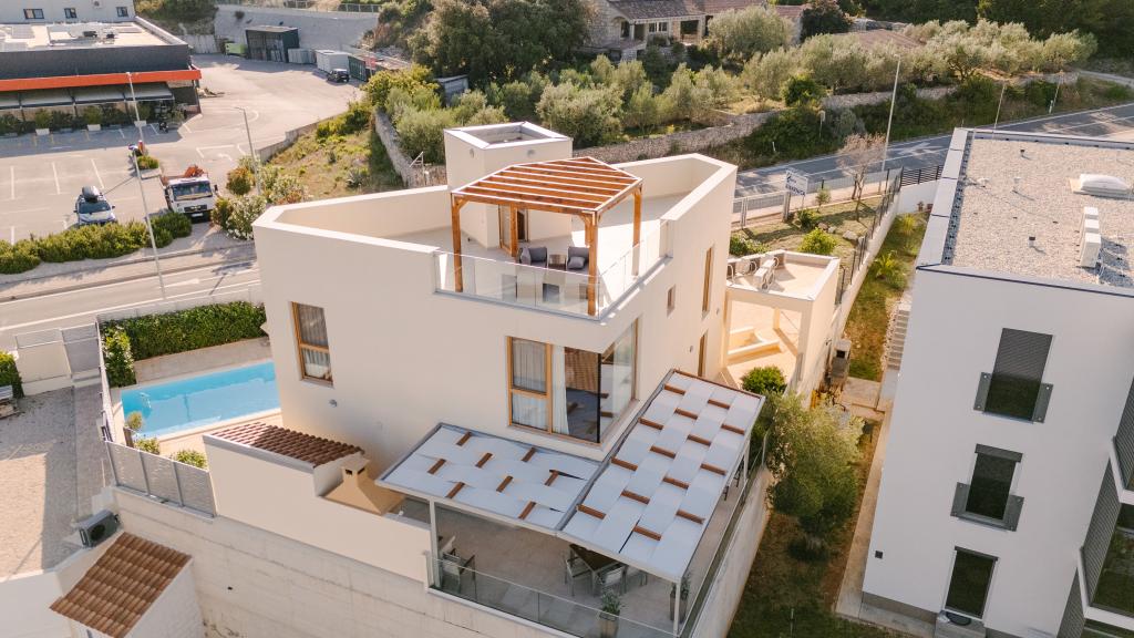 Welcome to a newly built holiday home with a private heated pool, located in Preko on the beautiful island of Ugljan. This modern house has 4 elegant bedrooms, 3 bathrooms and is surrounded by a spacious, fully fenced yard with lush greenery. The property includes private parking for up to 4 cars, a terrace with a barbecue area, a roof terrace with a beautiful 360° view and a small, landscaped garden. Enjoy beautiful sea views from every floor and reach the famous Jaz beach in just a 3-minute walk. Jaz beach is the largest sandy beach in Preko and proudly carries the Blue Flag eco-certification for clean and safe swimming. Across the street is the largest supermarket on the island, which includes a café, a butcher and a bakery.