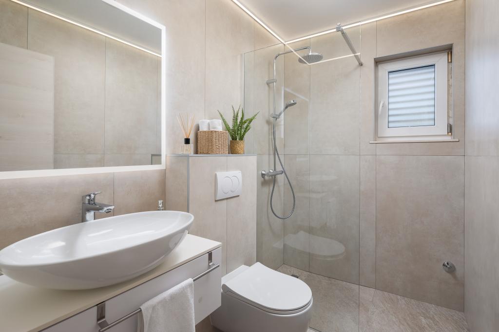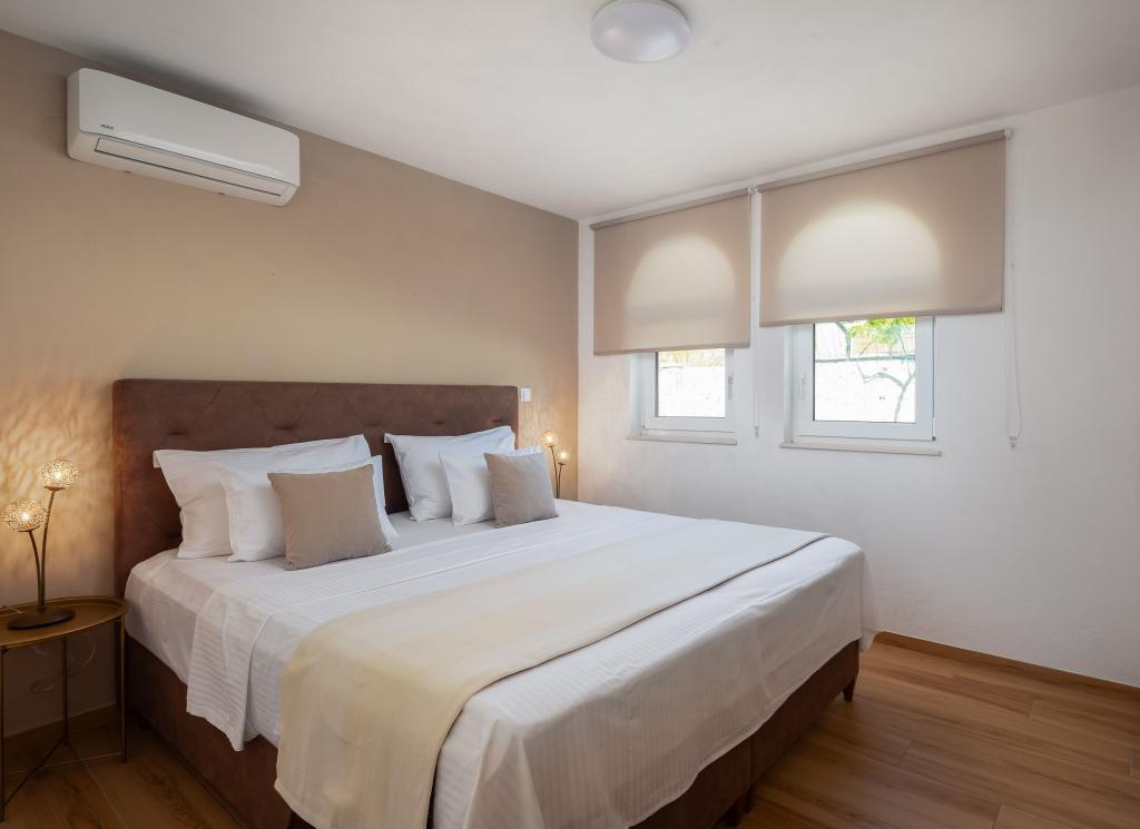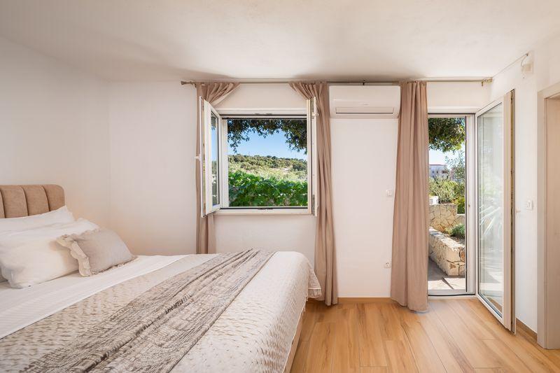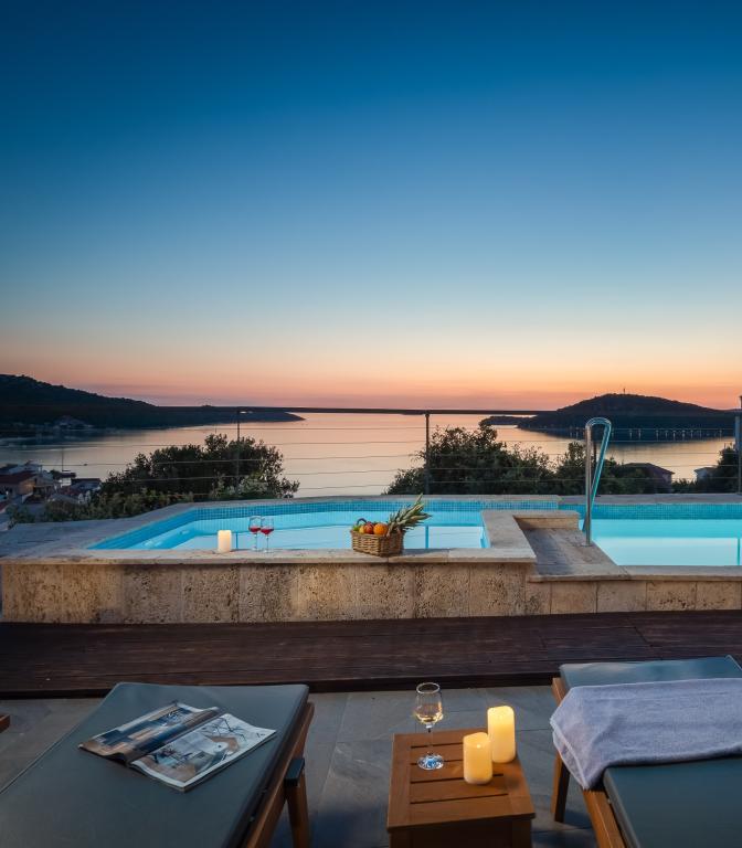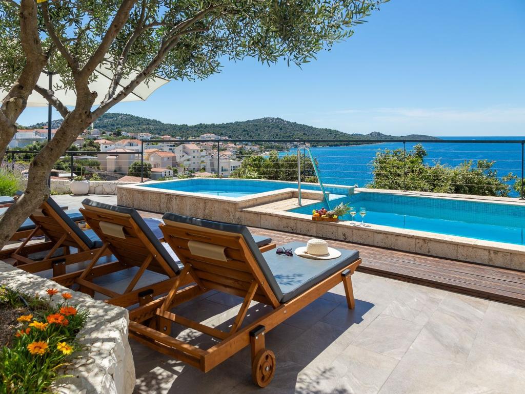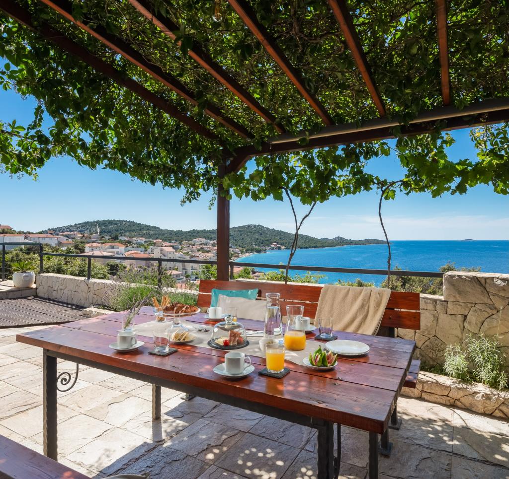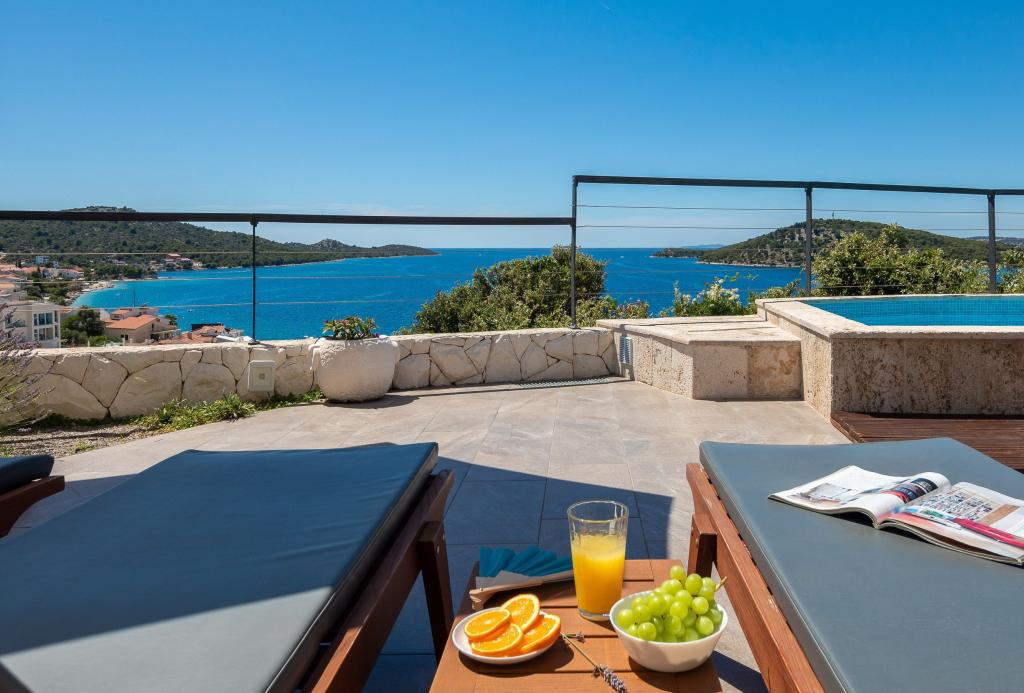 Charming villa with a beautiful sea view is located in Ražanj, a small town in the heart of Dalmatia. Villa Marija is an ideal choice for a vacation with family or friends in a peaceful, Mediterranean environment. Inside the villa there are 4 comfortable bedrooms, 3 modern bathrooms, a living room, a dining room and an equipped kitchen. In front of the villa is a spacious terrace with a swimming pool and sun loungers, which offers an open view of the sea. It is the perfect place for sunbathing and enjoying enchanting sunsets. The terrace also has an outdoor dining area and a barbecue. Guests have access to private parking in the fenced yard. The location of the villa offers numerous opportunities for enjoyment: swimming in the crystal clear sea, relaxing walks, cycling along well-maintained paths, boat trips, trips to national parks. Nearby are also popular tourist destinations Zadar, Šibenik, Primošten, Trogir and Split, which will enchant you with their beauty and rich cultural heritage.