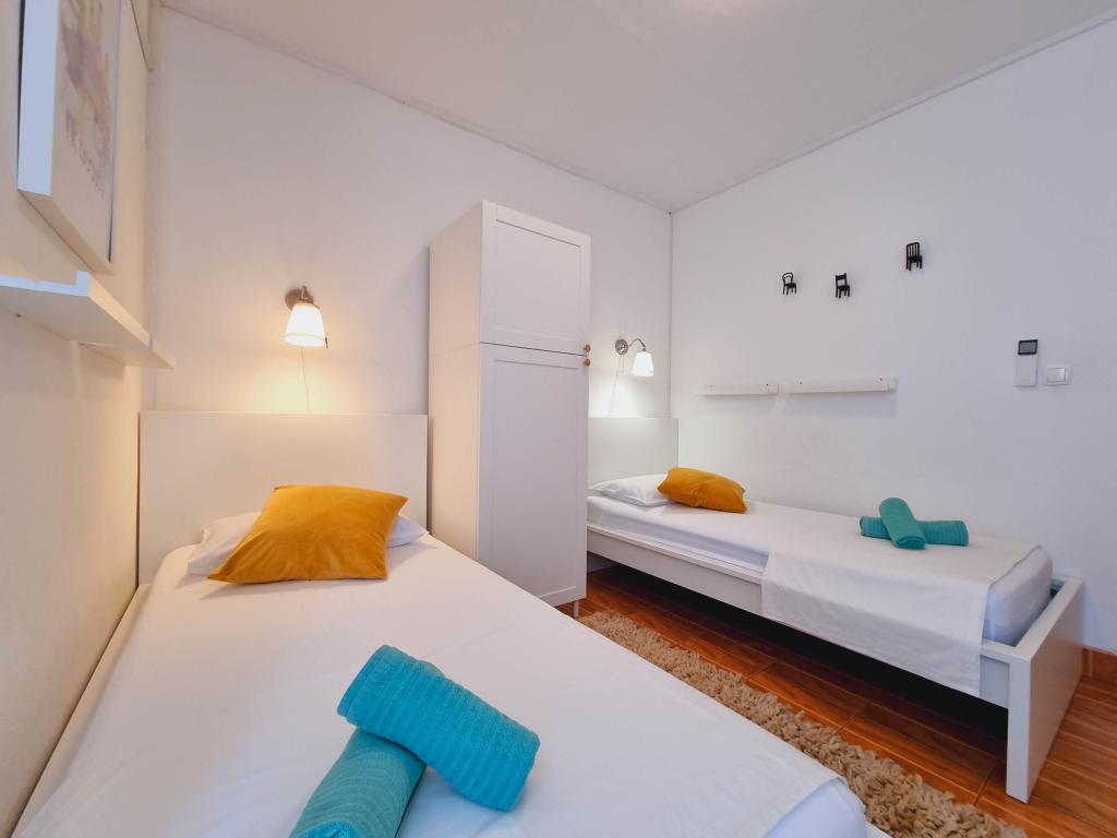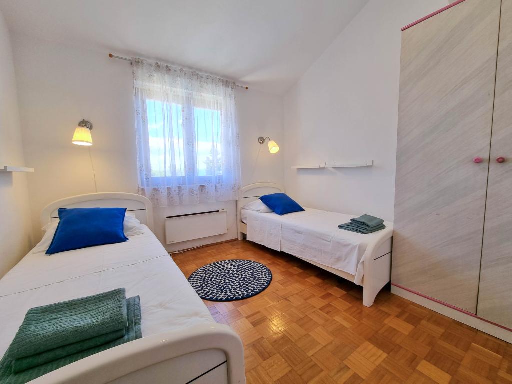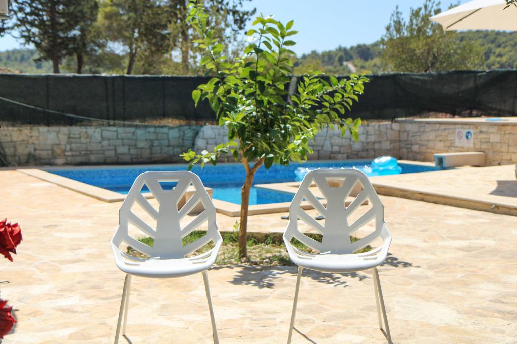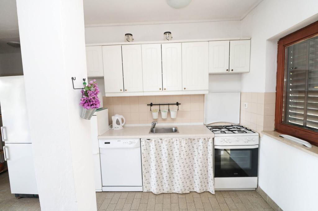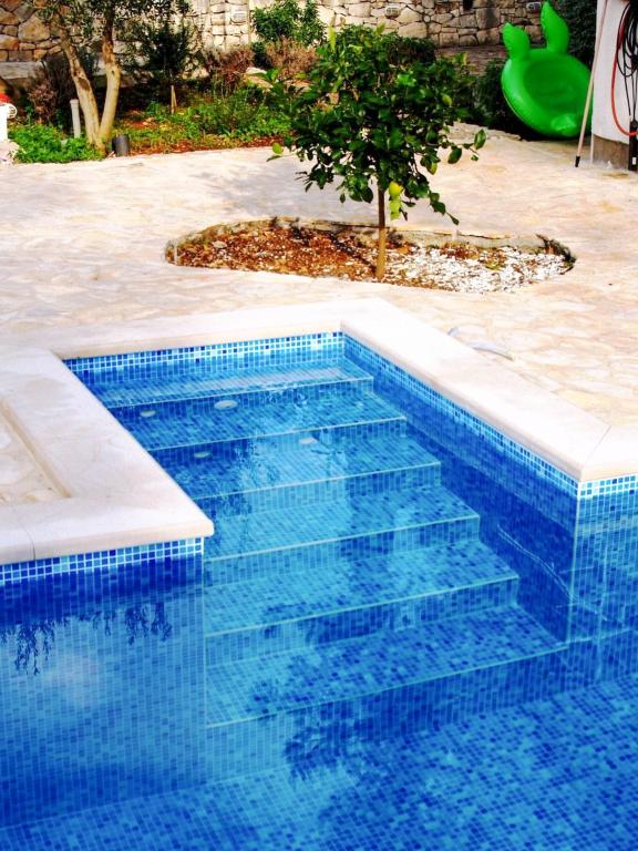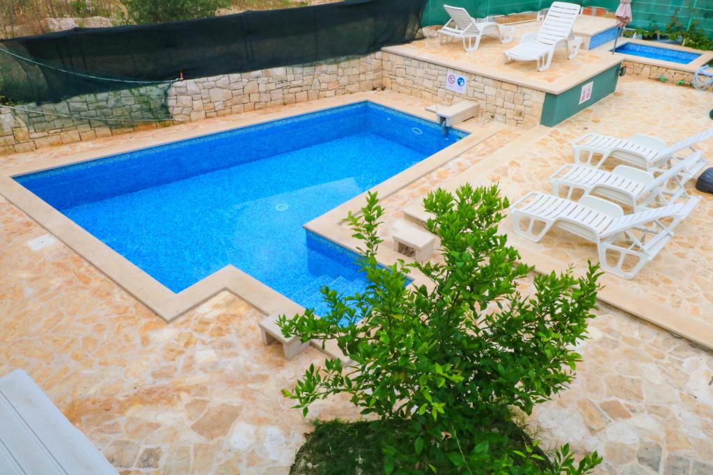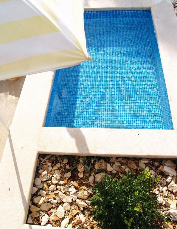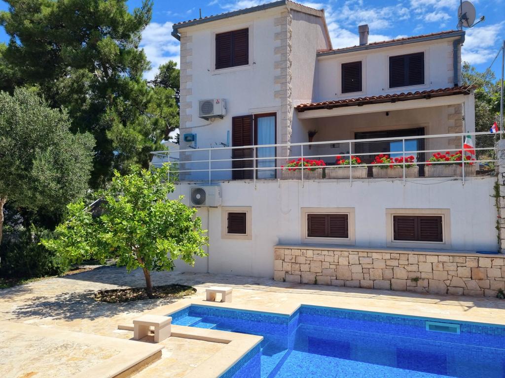 Villa Dvornik provides complete privacy in comfortable accommodation for families with children, student groups and family gatherings of several generations. It has a view of the sea and is only 300 meters away from the sea and the beach. Living area of 110 m2 + 25 m2 terrace, large garden area of 280 m2 covered with stone slabs, with 4 rooms (8 beds) and two swimming pools. A large pool with 4 massage jets of 24 m2 and a depth of 1.5 m for adults and a smaller pool intended for small children of size 3.5 m2 and a depth of 0.5 m. Both pools are heated by means of 10 m2 solar collectors that allow the temperature of the pool of 21 °C in May and October. The outdoor shower and grill are located in the area surrounding the house. The house is air-conditioned and has access to wireless internet. Three parking spaces are provided within the property surrounding the house. Pets are welcome.