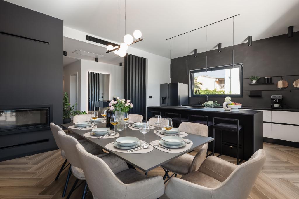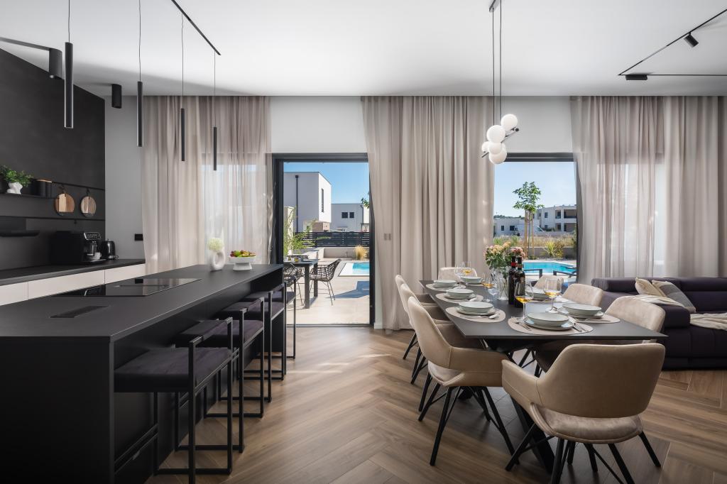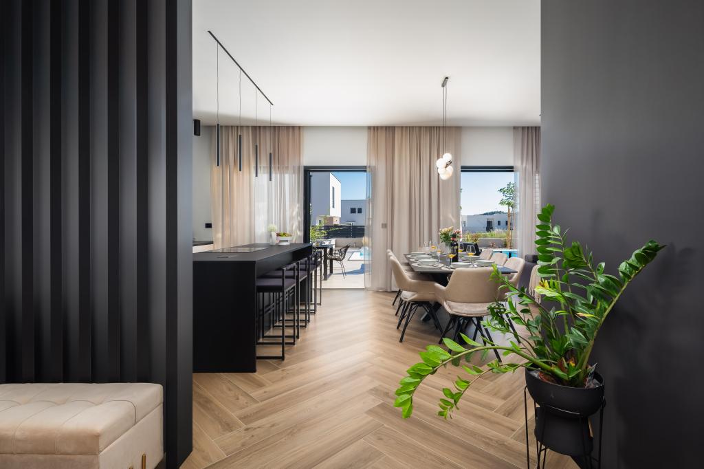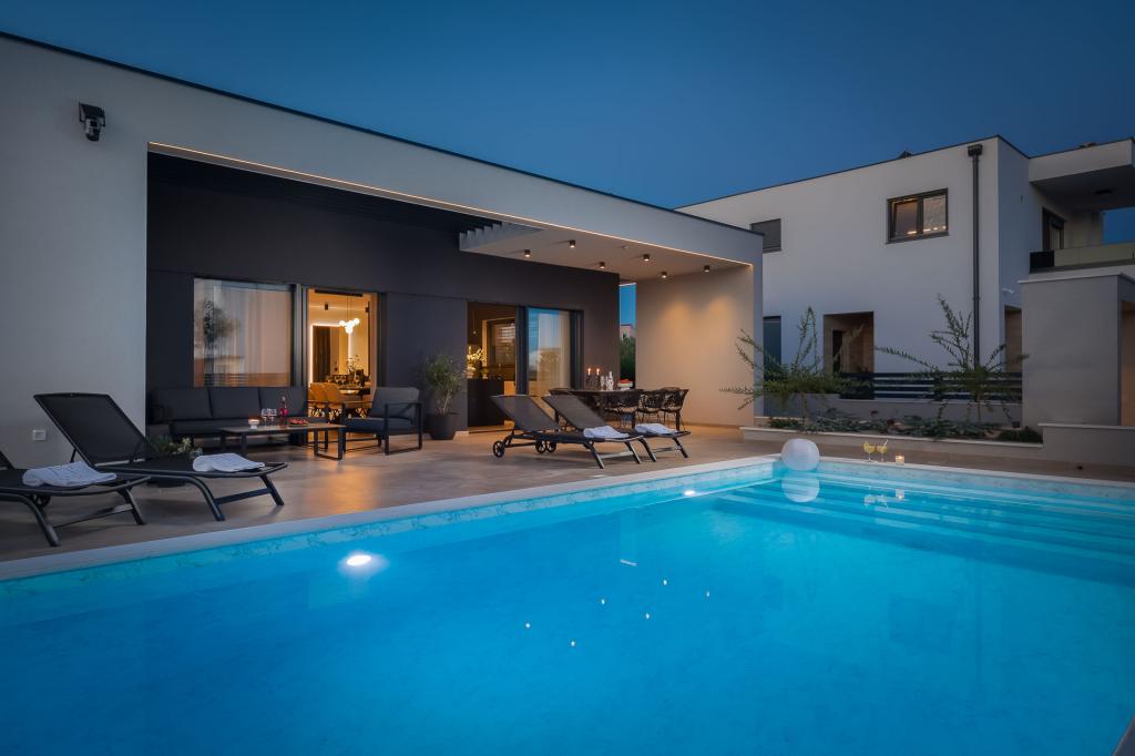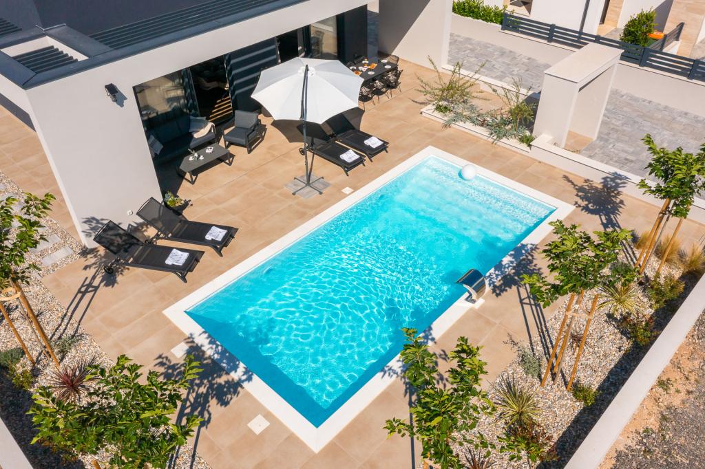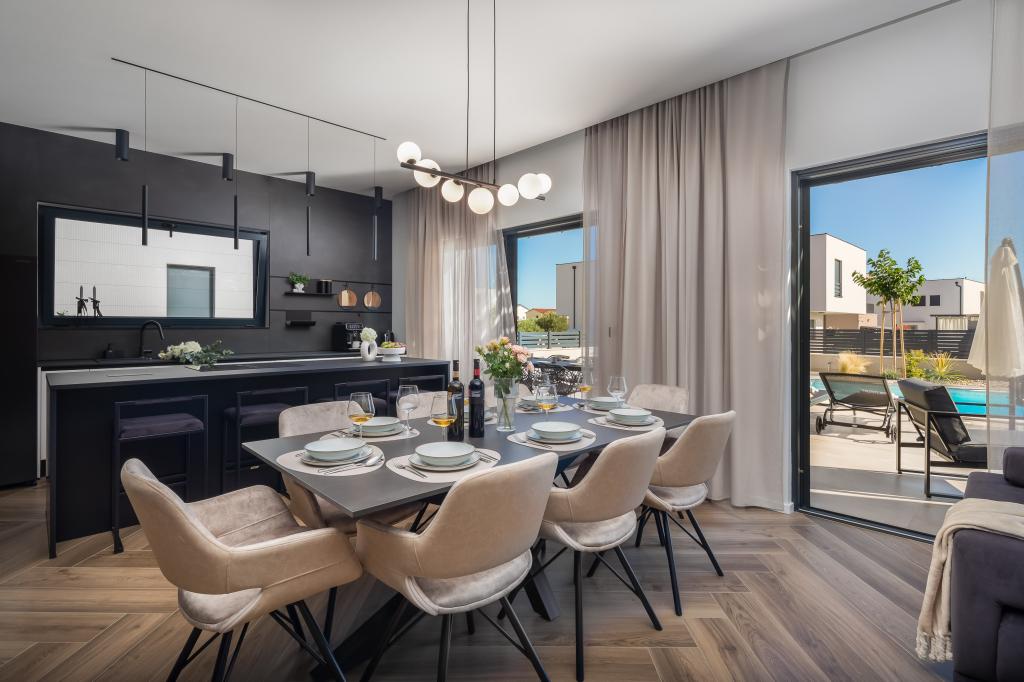 Beautifully decorated modern villa in Vodice in a quiet village, ideal for your vacation. The house is a single-storey house, with an open space of a large kitchen and a spacious living room with a comfortable sofa. The villa has 3 bedrooms with attached bathrooms. You can relax on the spacious terrace by the pool and enjoy prepared meals from the grill. The villa is fenced
